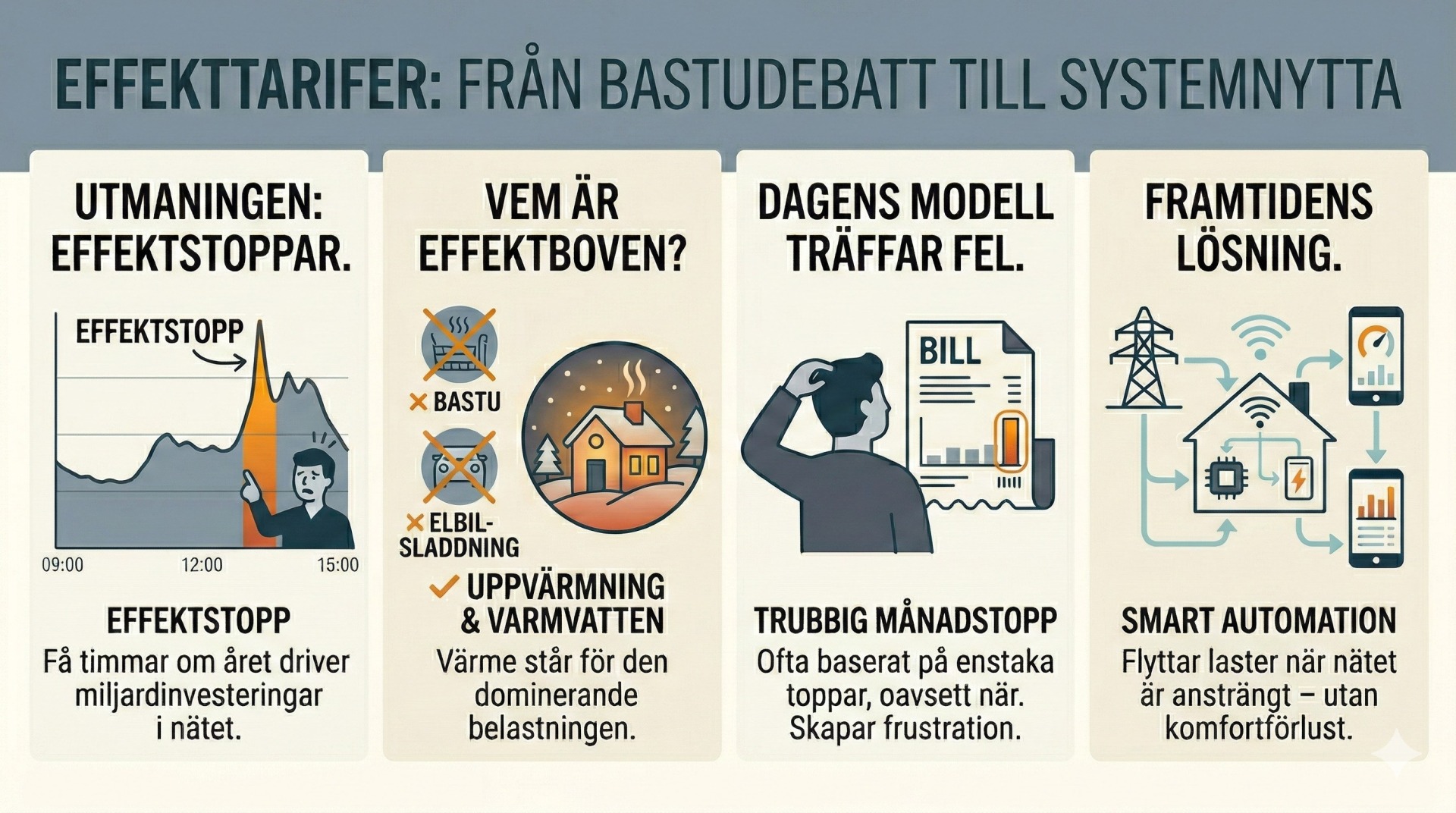 Effekttariffer är nödvändiga för att hantera kostsamma belastningstoppar i elnätet, men dagens modeller kritiseras för att vara trubbiga och fokusera på fel saker som hushållsmaskiner istället för den dominerande uppvärmningen. För att lyckas krävs en modernisering där avgifterna kopplas till verklig nätbelastning och kombineras med automatiserad styrning som inte kräver manuellt arbete av konsumenten.